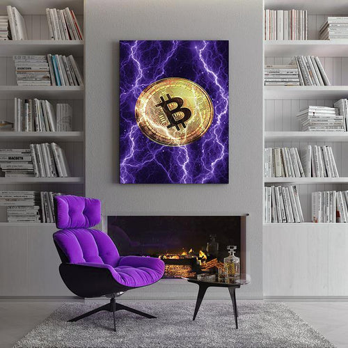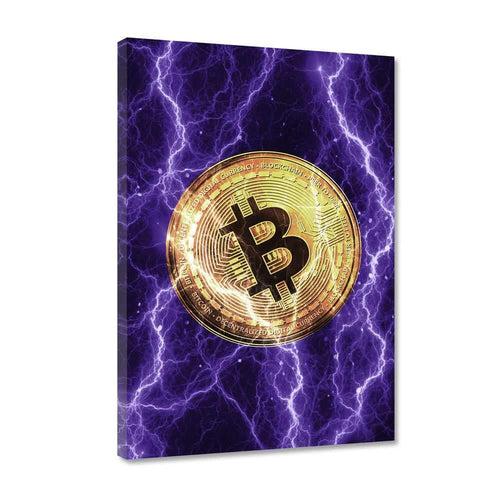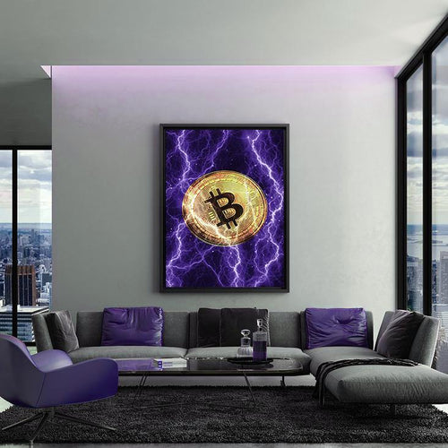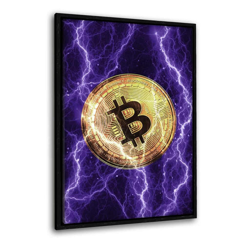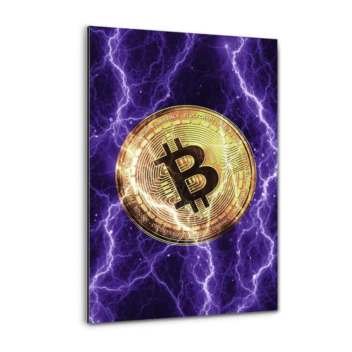 Dieses einzigartige Kunstwerk stellt den klassischen Bitcoin in einem lila Gewitter dar und wird definitiv zu einem echten Hingucker in Deinem Büro oder Wohnraum avancieren.